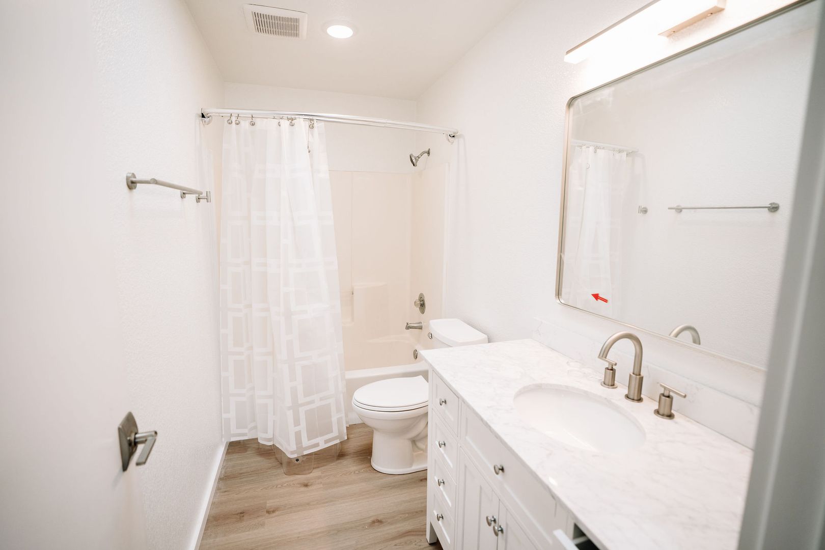 The bathroom has been fully upgraded with contemporary fixtures and a clean, modern design. Additional features include new flooring, fresh paint, and updated lighting throughout the unit.
