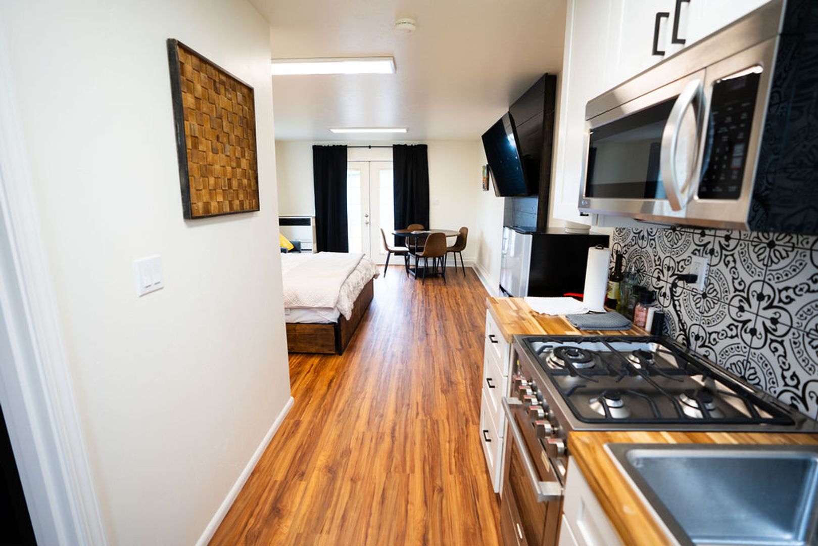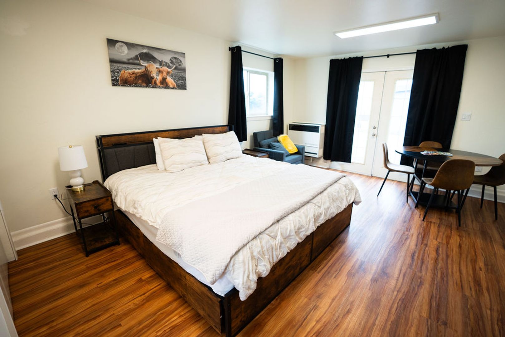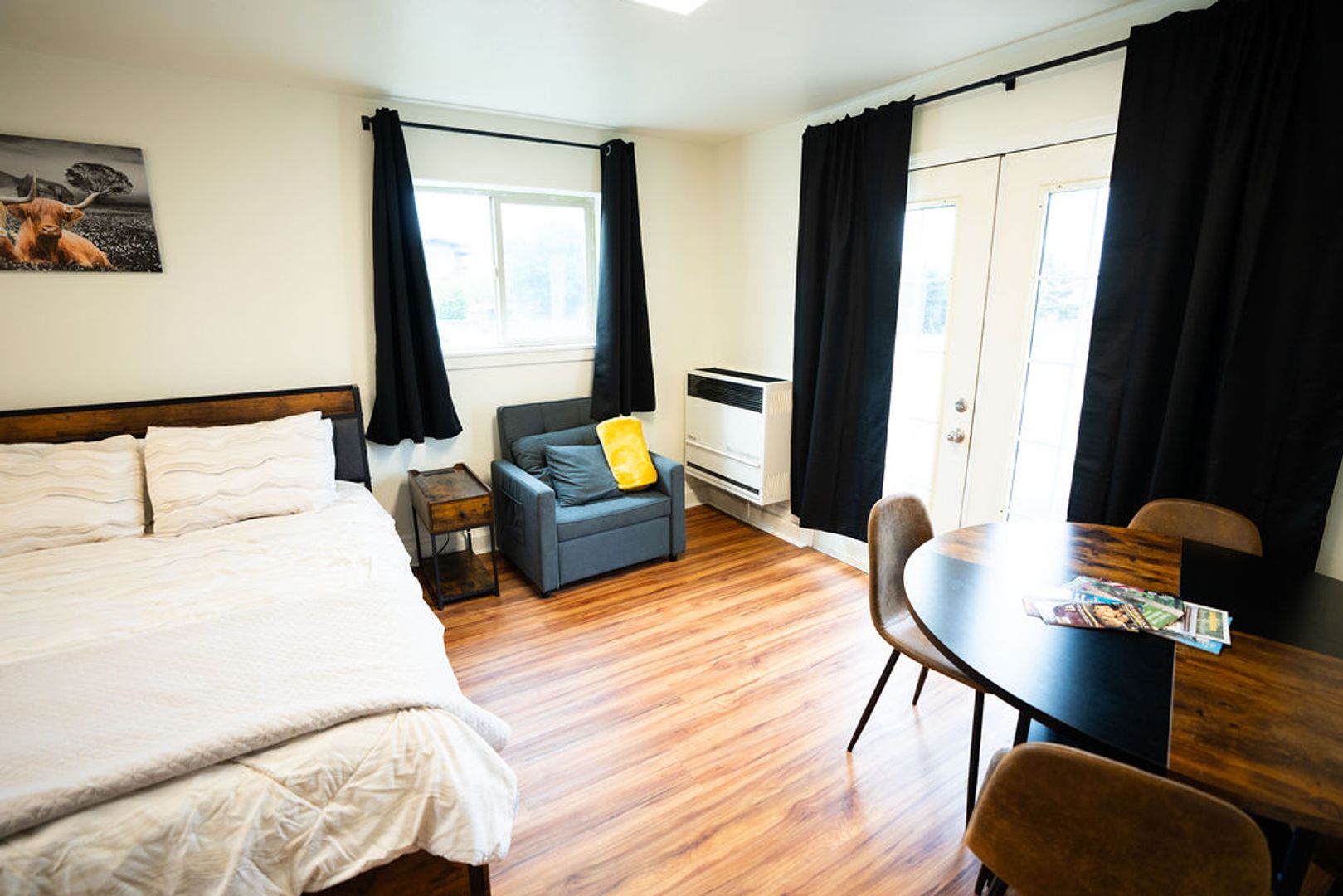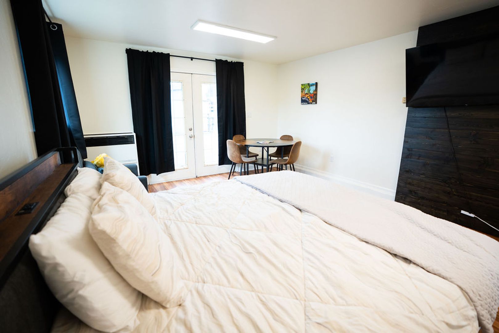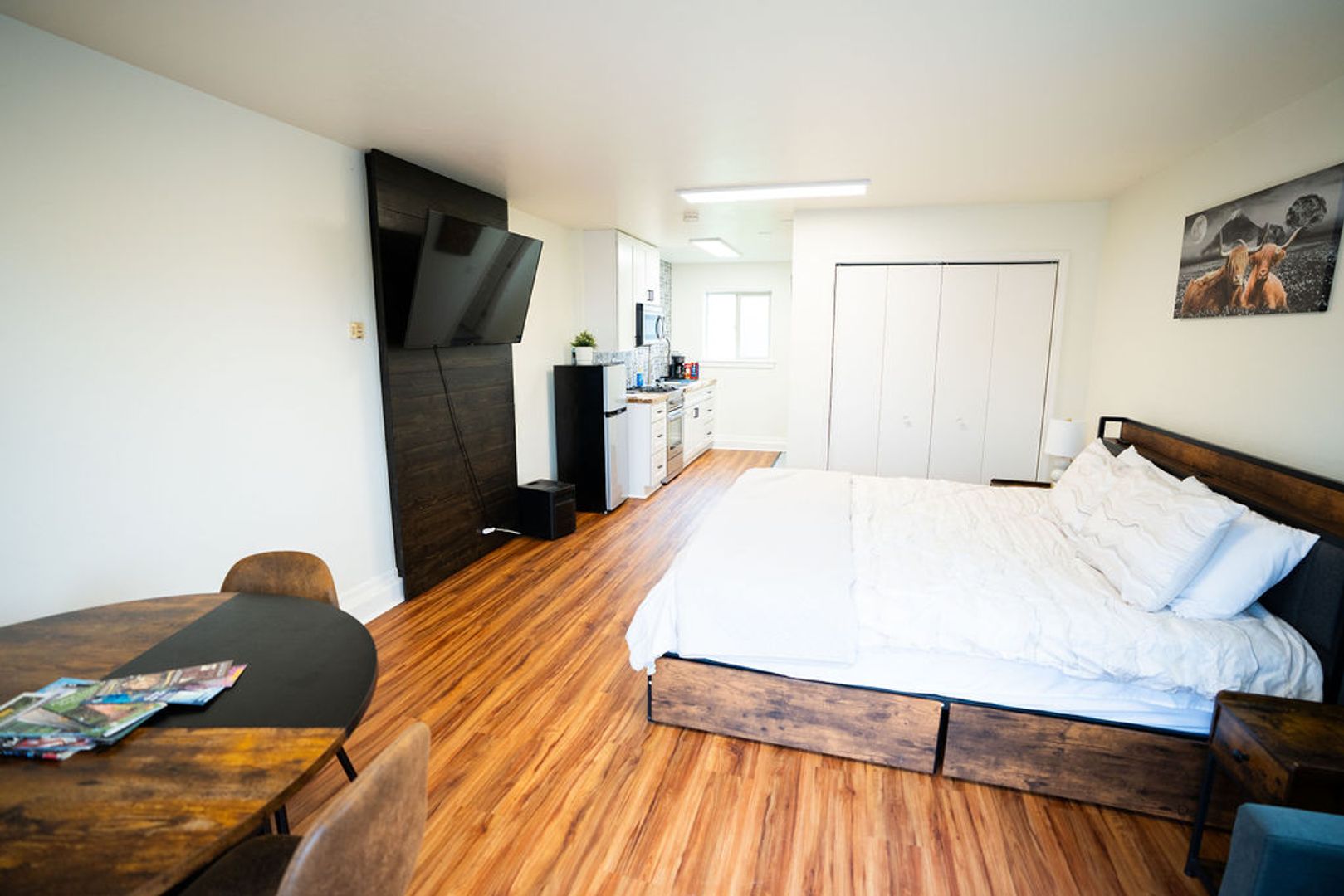 Located in McKinleyville, This studio is behind Six Rivers Brewery! The home features, open space, with king bed, table, mounted TV, full kitchen with lots of counter space and cabinet space for the place. The bathroom is full size with step in shower and nice size vanity and space.
