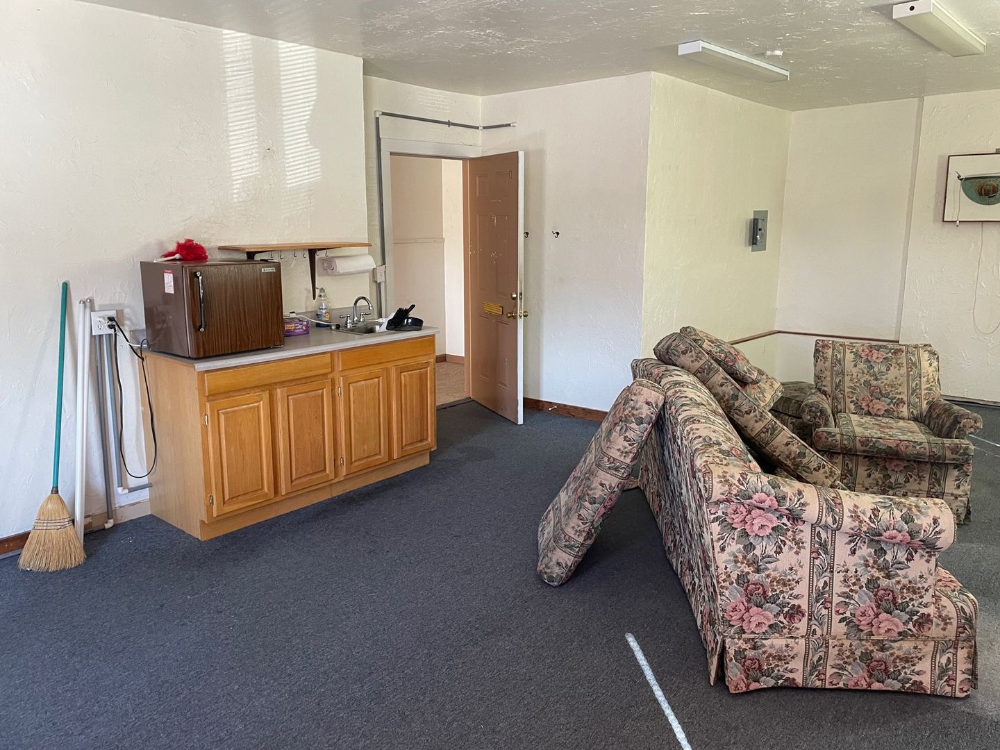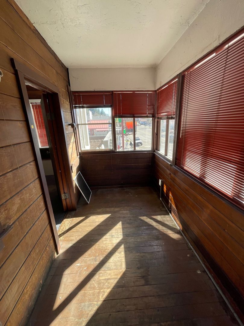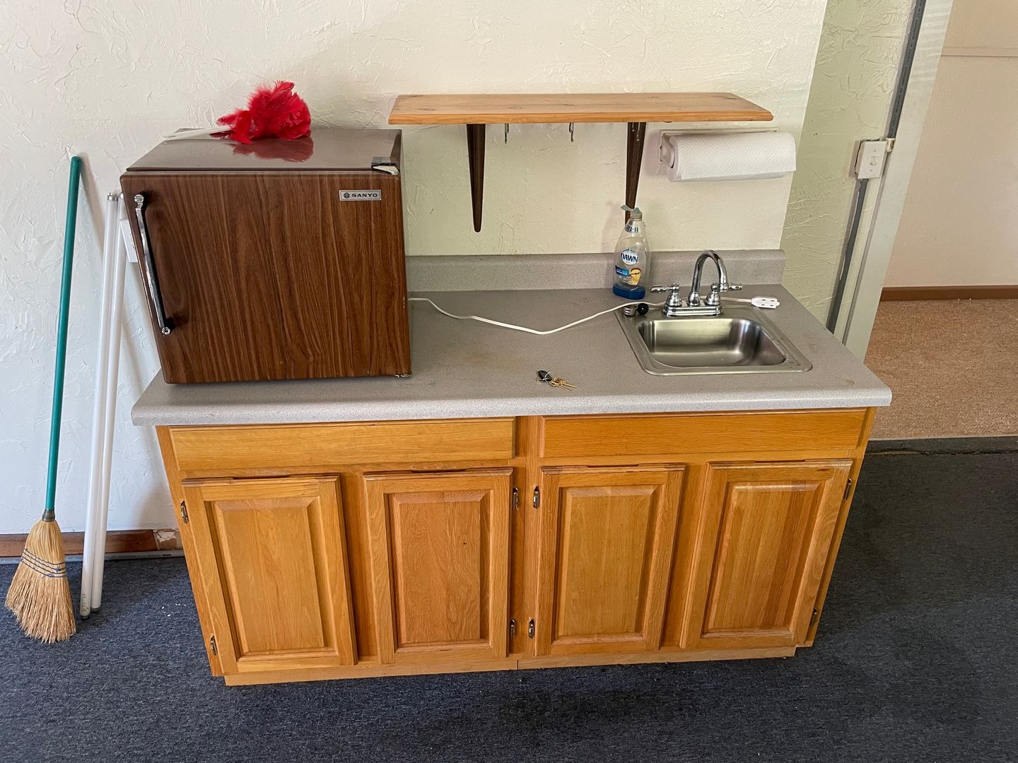 This office is upstairs, features a large open floor plan with a cabinet for storage.