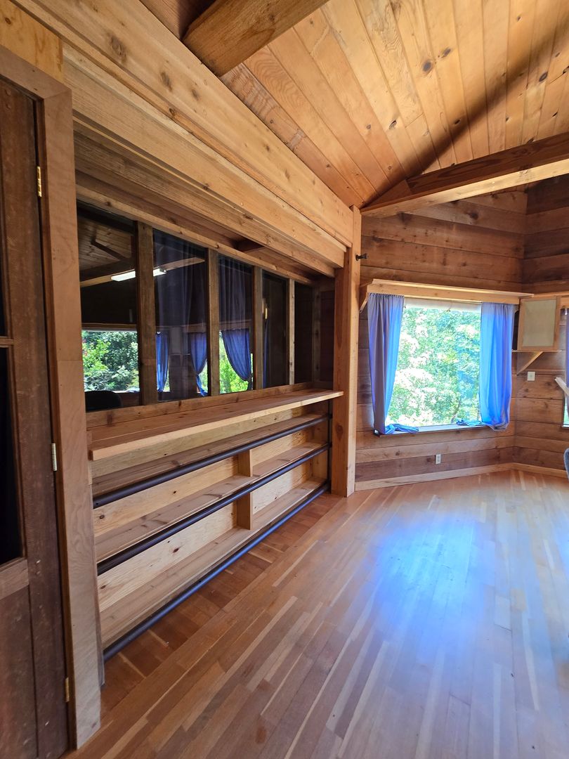 Nestled deep in a quiet forest, this enchanting two-bedroom artist’s cabin feels like a secret retreat kissed by nature. A winding gravel path leads through tall trees to a handcrafted wooden cabin that glows warmly in the morning light. The exterior is rustic yet charming. Inside, light pours through generously sized windows, illuminating open, airy spaces. The main studio-like living room is anchored by a fireplace and features high, beamed ceilings that invite creativity to soar. Wide hardwood floors carry the subtle scents of oak and pine. Entry had mud room and washer hook ups.