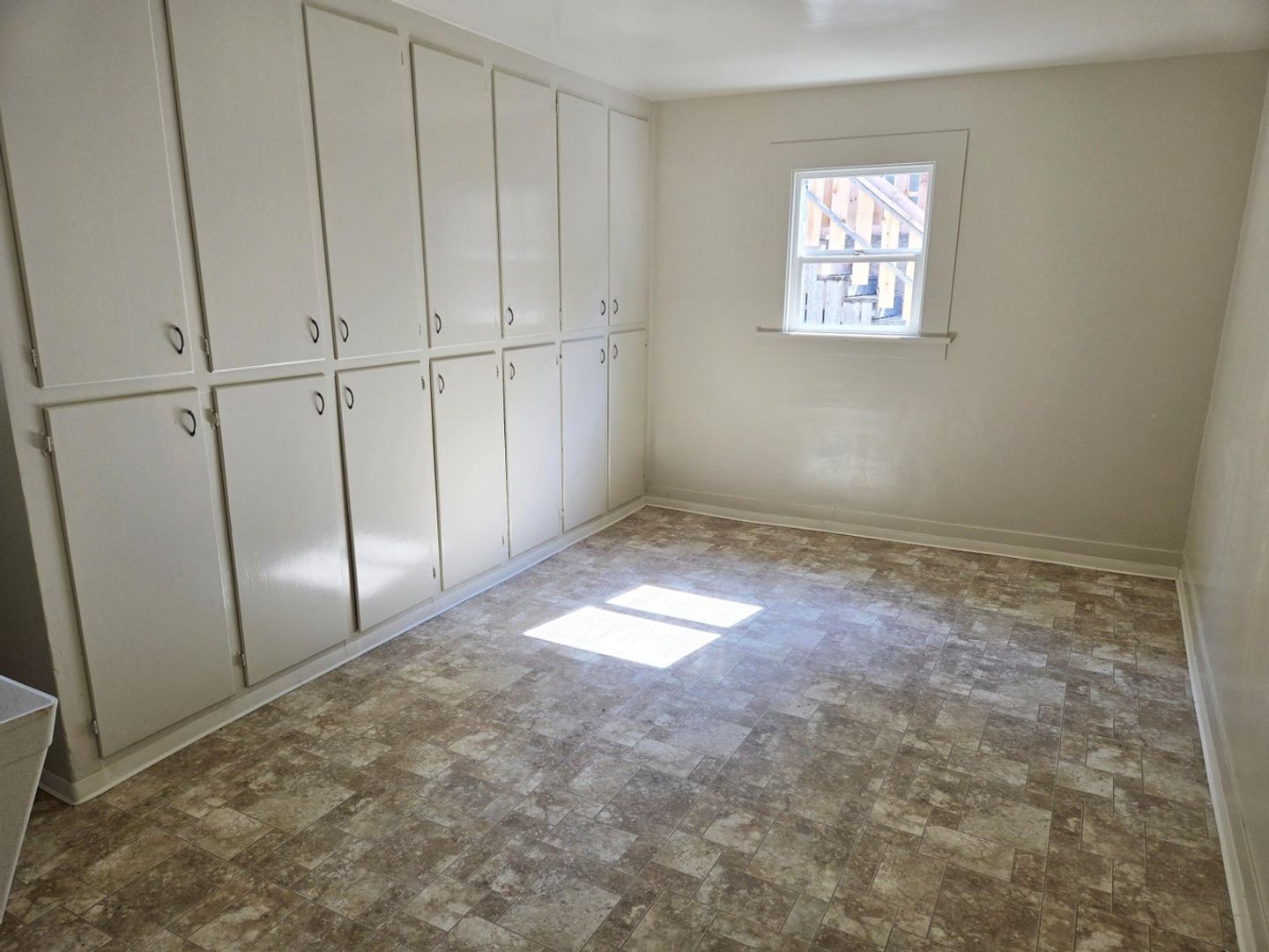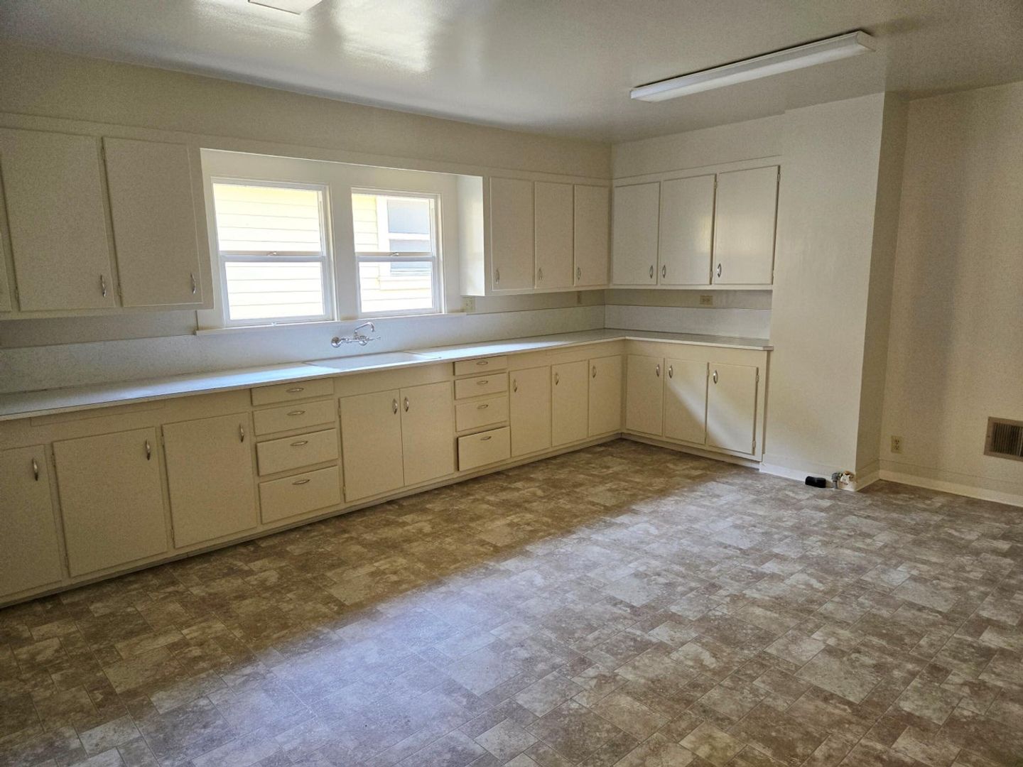 The spacious kitchen accommodates a dining table, has new vinyl flooring