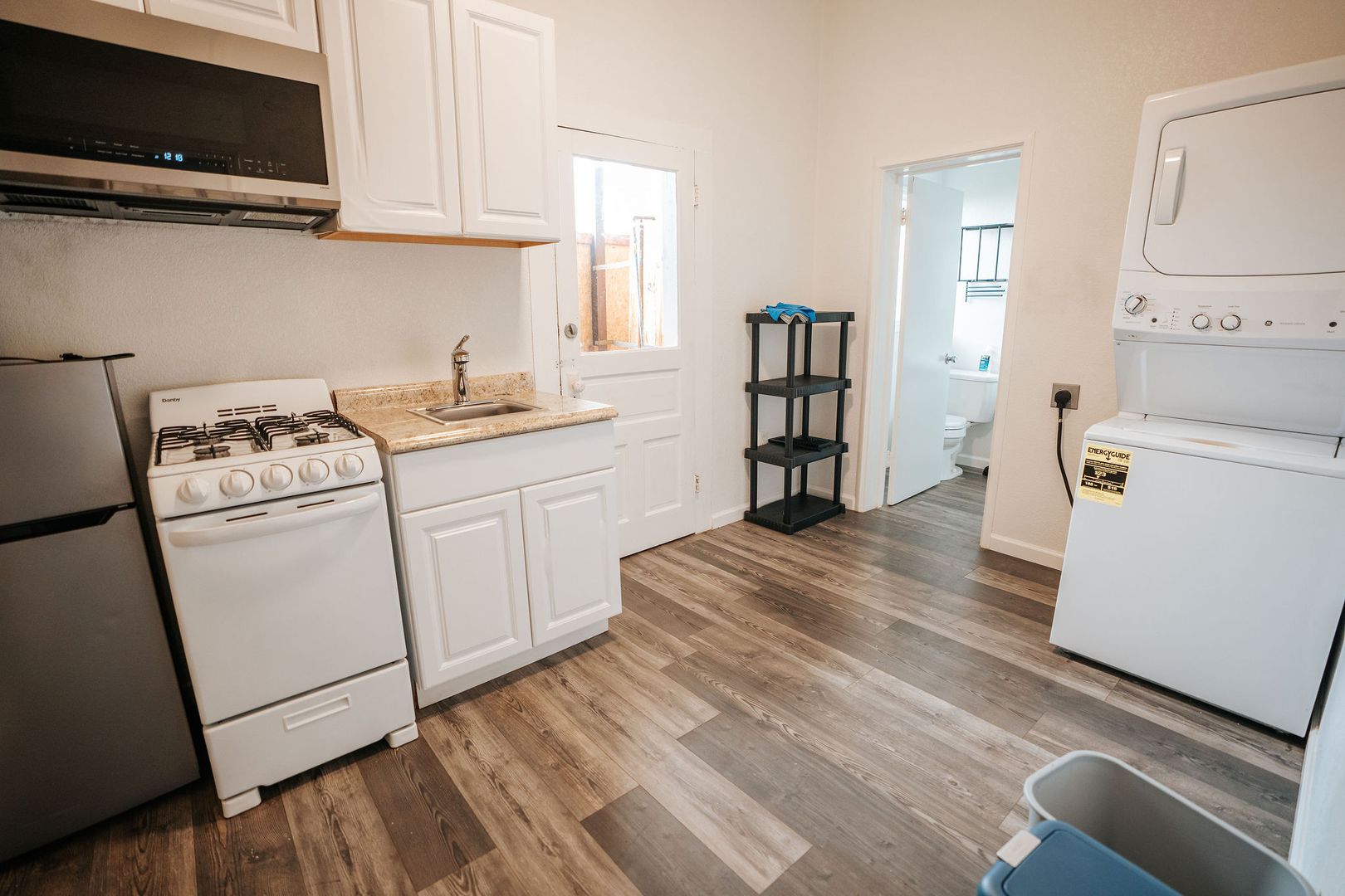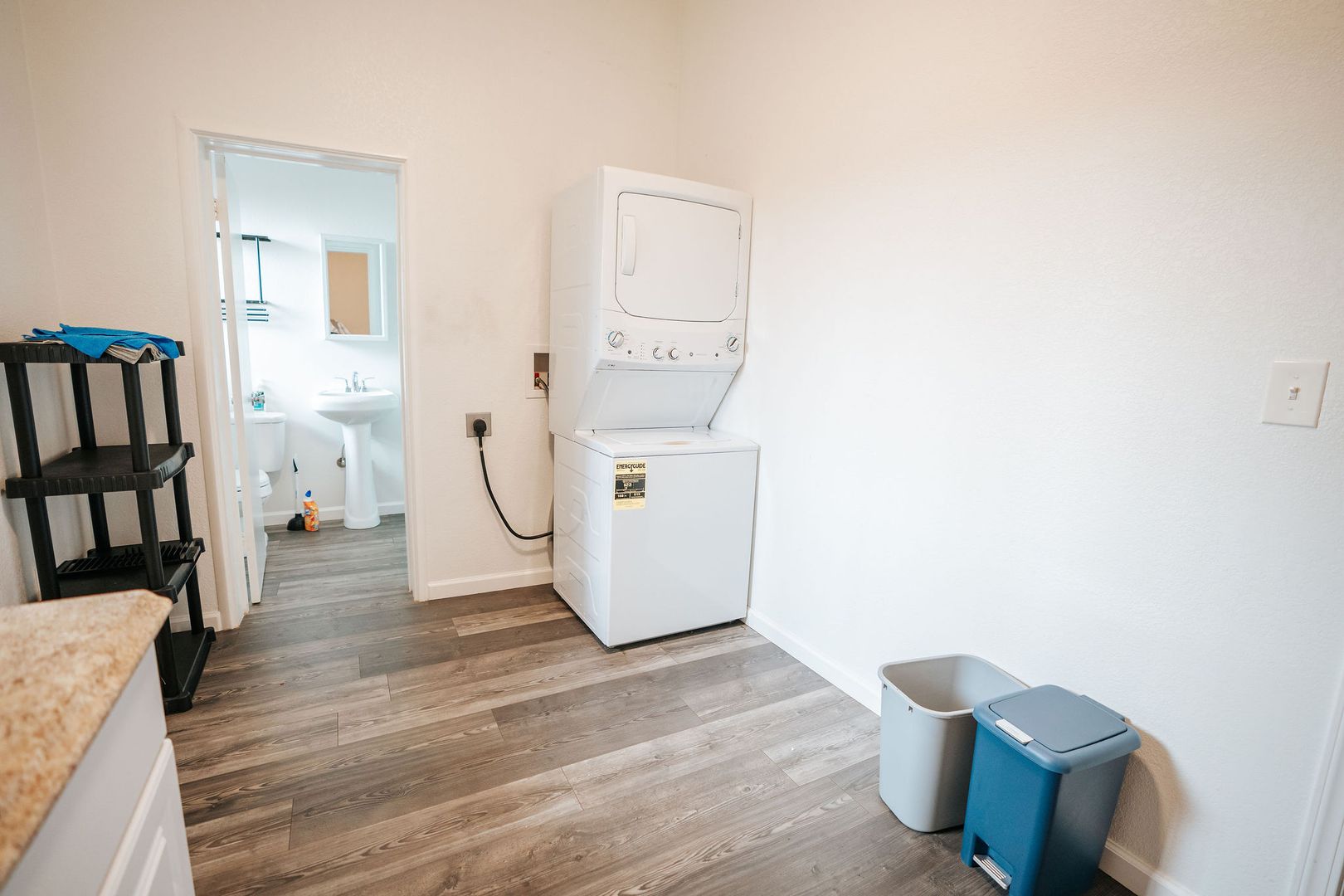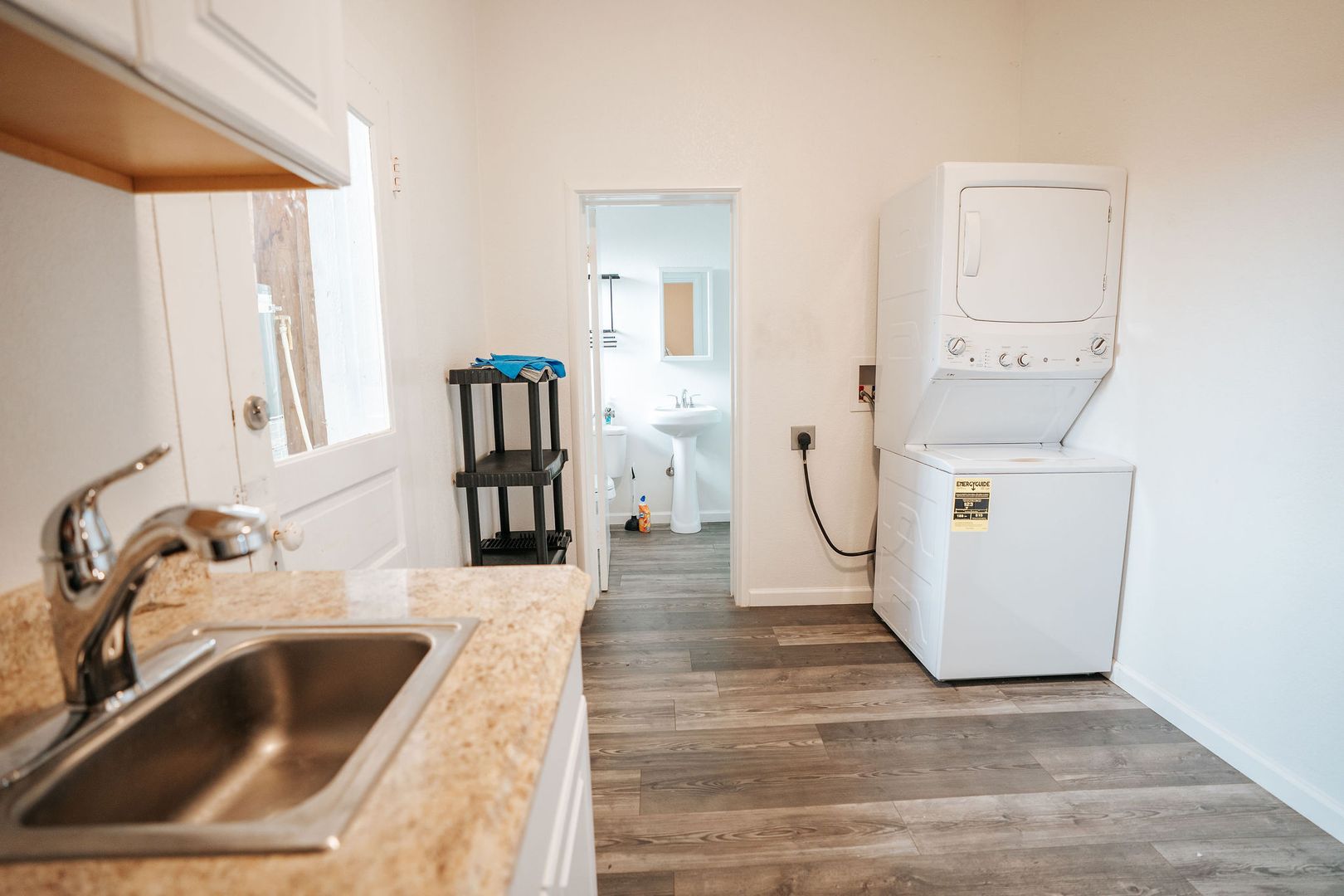 Fully furnished one bedroom apartment with newer vinyl flooring. Apartment has full bathrooms, one with a tub/shower. The kitchen comes equipped with a gas stove and microwave/range hood combo, and stainless steel refrigerator. Bedroom is inside the living room area. In unit laundry area with stackable washer/dryer combo. Convenient downtown location, close to local shops and bus stops.