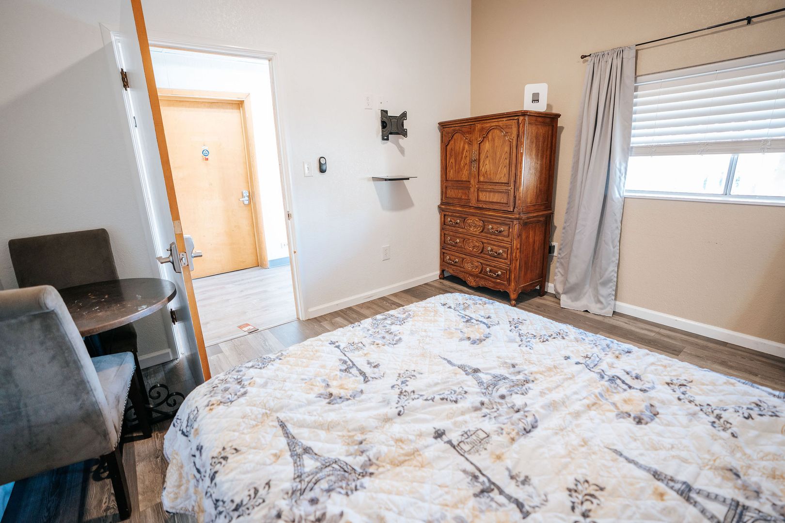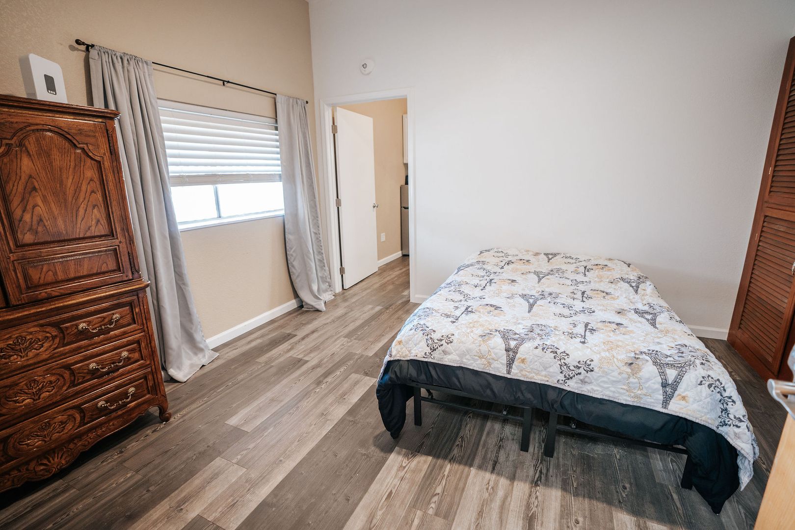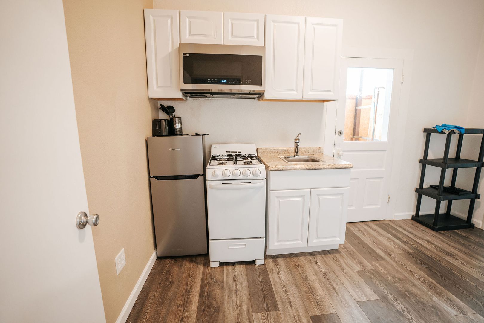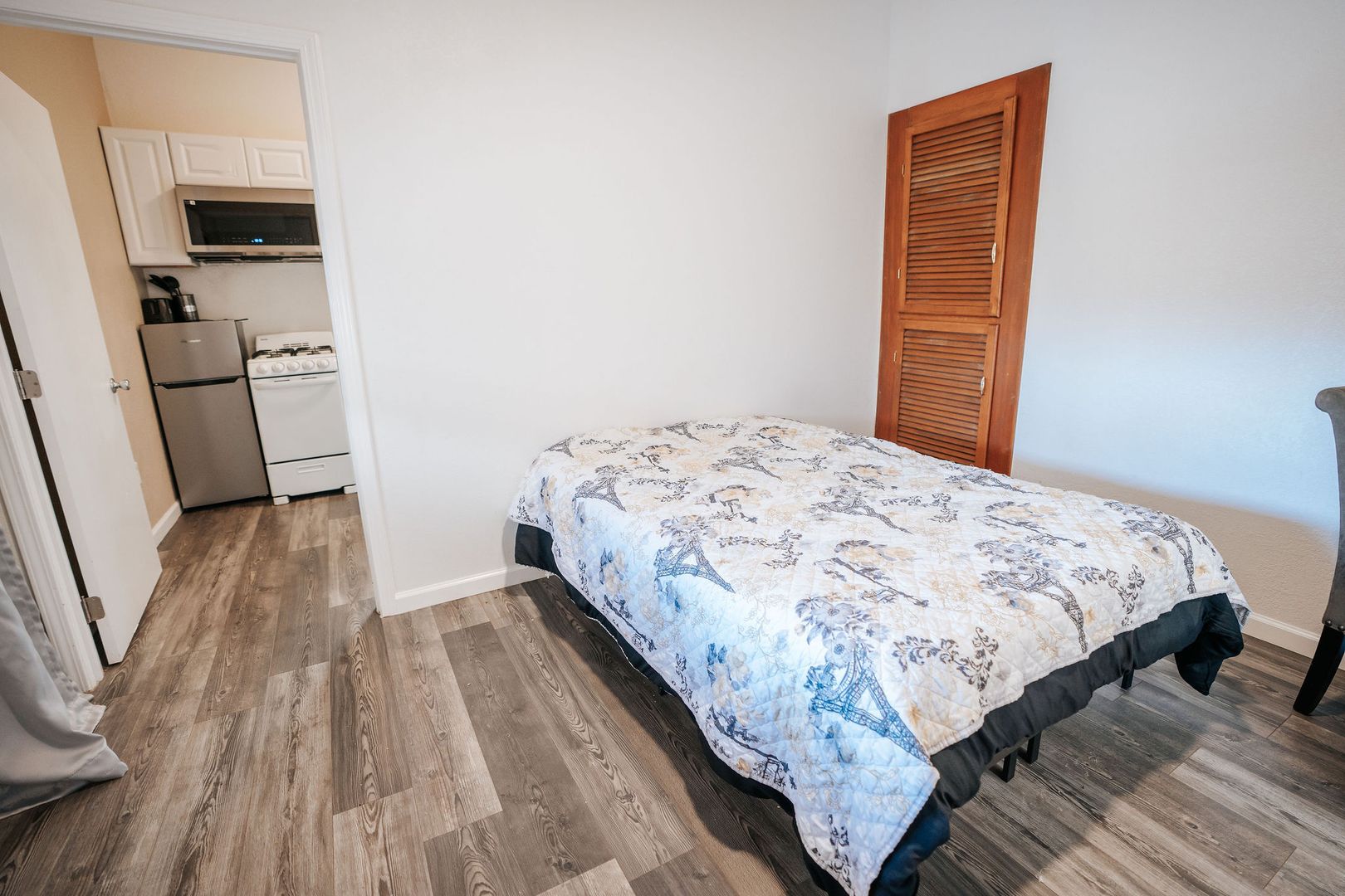 Fully furnished one bedroom apartment with newer vinyl flooring. Apartment has full bathrooms, one with a tub/shower. The kitchen comes equipped with a gas stove and microwave/range hood combo, and stainless steel refrigerator. Bedroom is inside the living room area. In unit laundry area with stackable washer/dryer combo. Convenient downtown location, close to local shops and bus stops.
