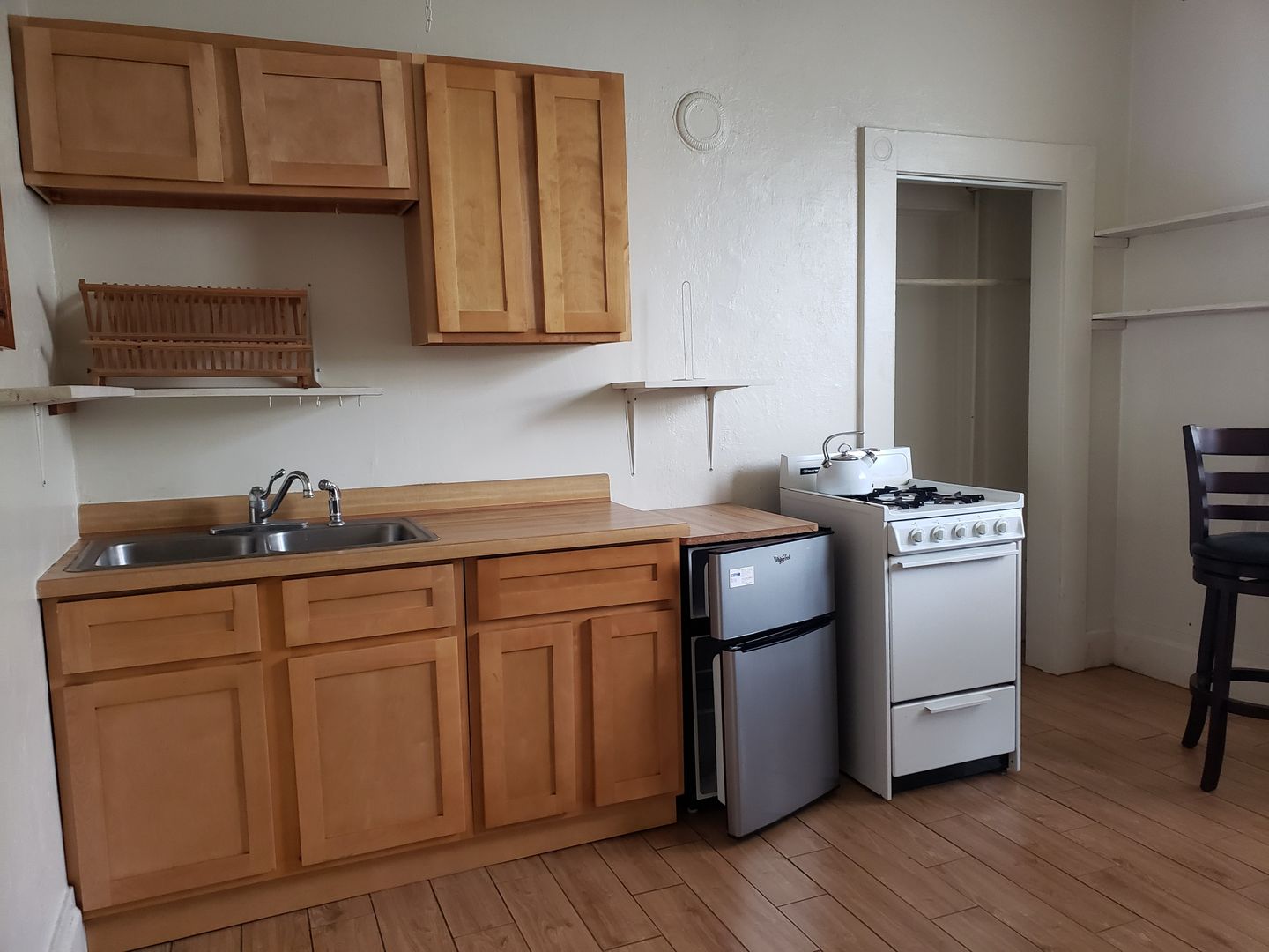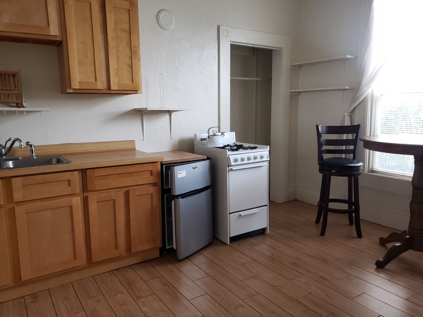 Hostel style Apartment in Old Town Eureka with a view of Woodley Island! The main house is built of units down stairs and units upstairs each floor shares a bathroom. Each unit is a room with a kitchenet, stove and fridge with space for shelves, and hanging clothing. A community backyard for the tenants to enjoy with alley access, right in the center of Old Town and transpiration. Water/Sewer/PG&E/Garbage are included. Street Parking is available