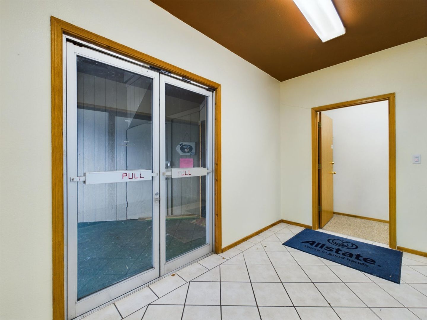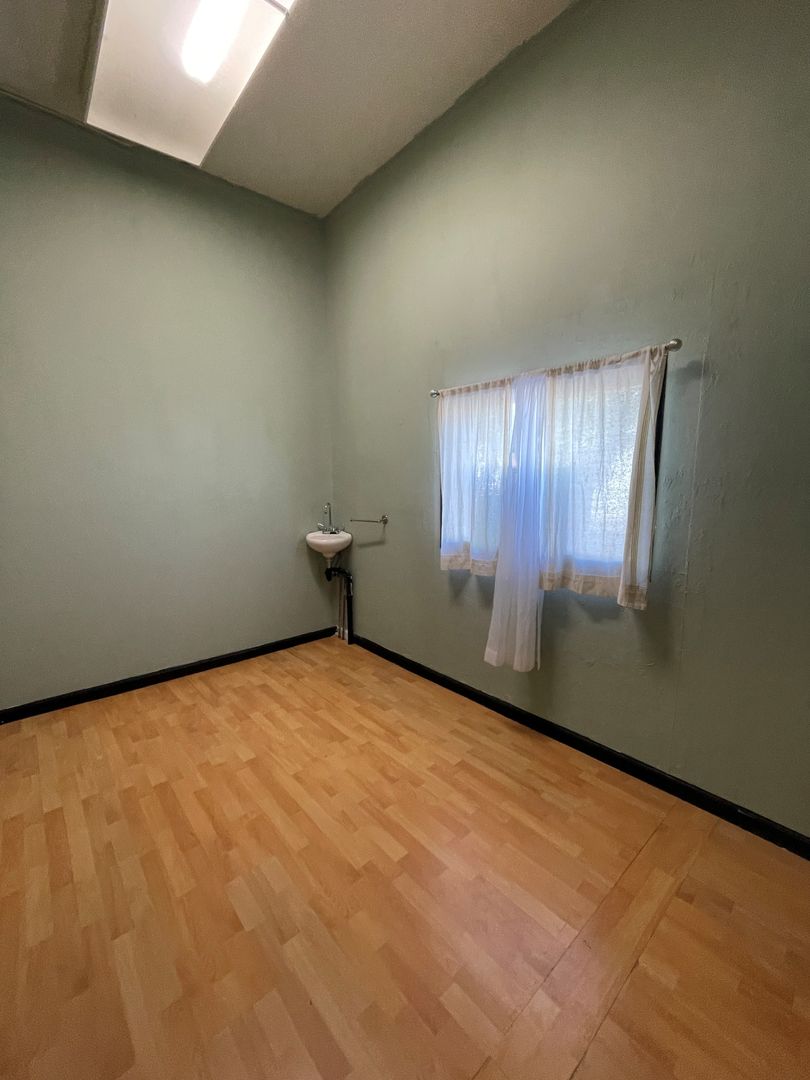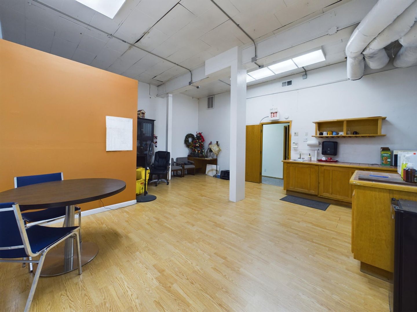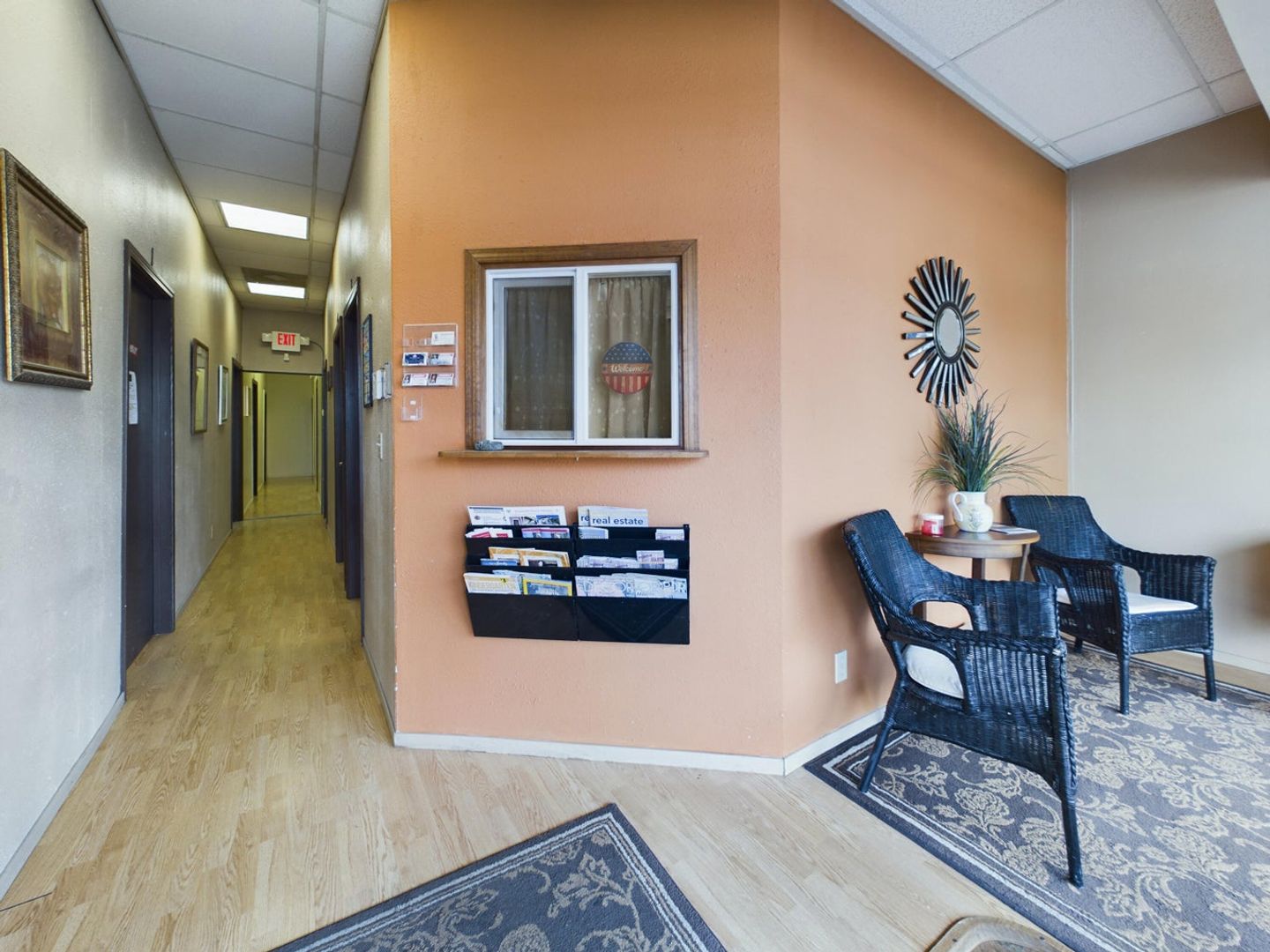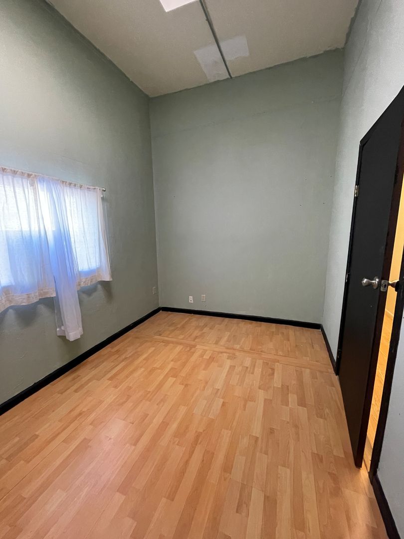 This office suite features locked entry, with waiting room. The office is small but is large enough for single person operating out of the space. Common room with kitchen and two ADA bathrooms in the back with entry in the back too with ramp.