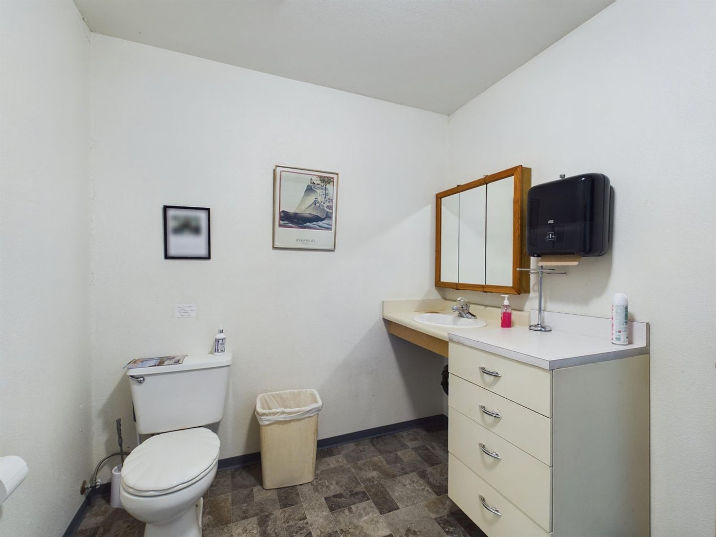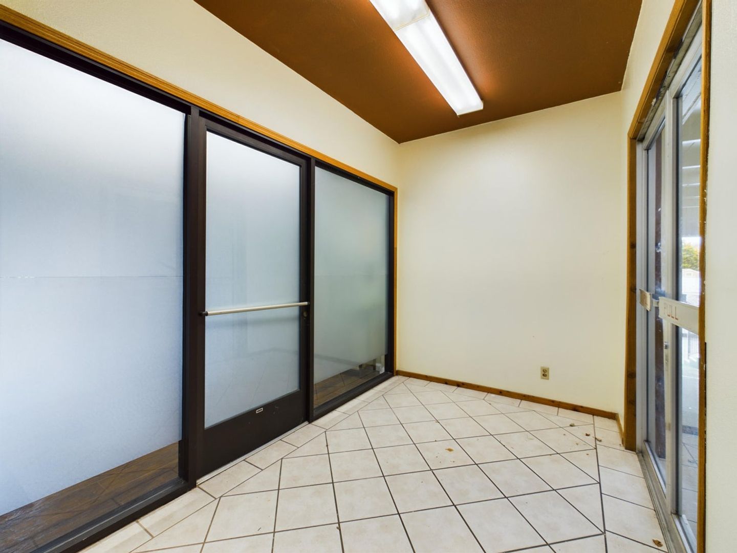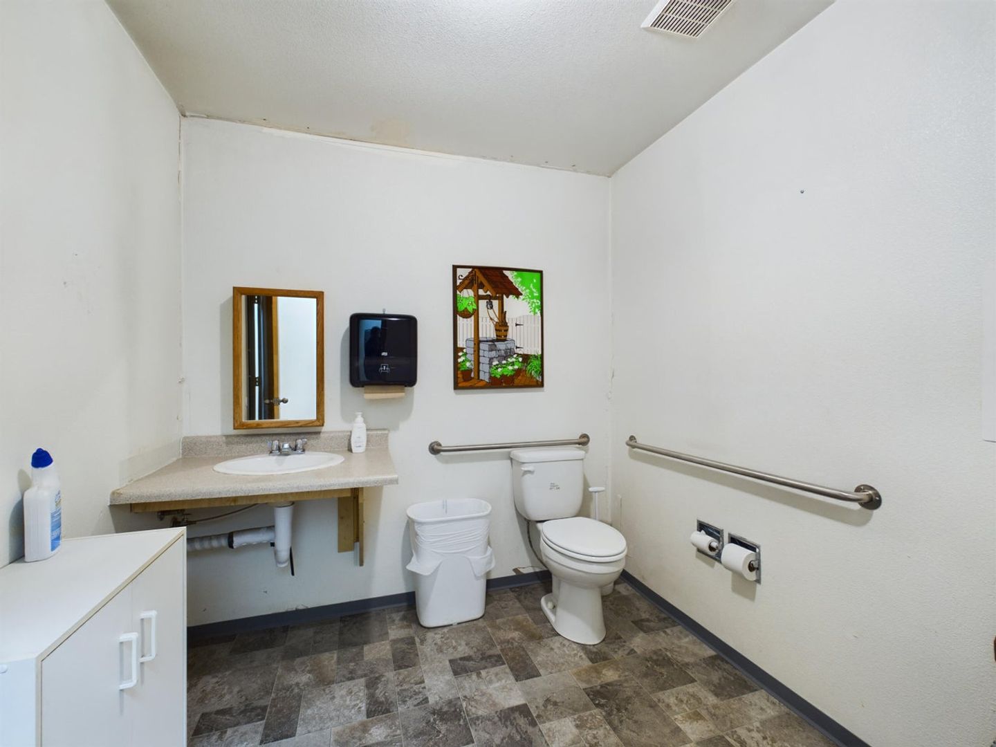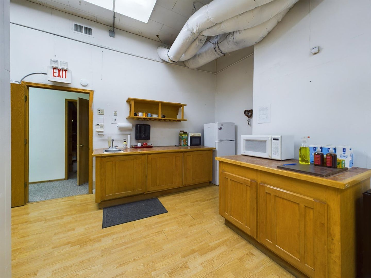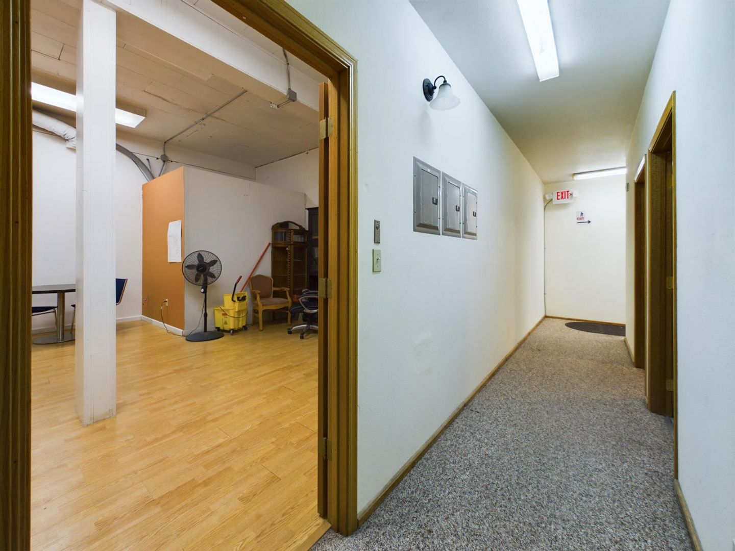 This office suite features locked entry, with waiting room. The office is small but is large enough for single person operating out of the space. Common room with kitchen and two ADA bathrooms in the back with entry in the back too with ramp.